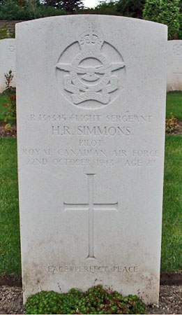 Pilot - F/Sgt Hugh Robertson Simmons RCAF (R/134345), aged 27, of Winnipeg, Manitoba, Canada. Buried Harrogate Stonefall Cemetery, Yorkshire (C/D/2).
