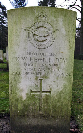 Kenneth Hewitt was the son of William Buxton and Jessie Florence Hewitt, of Cricklewood, Middlesex. For service with 460 Squadron he was awarded the DFM, Gazetted on 21st April 1944. Kenneth received a commission on 18th August 1944 (183777) and was later posted to 582 Squadron. On 23rd December 1944 he was flying in Lancaster PB141 and undertaking Ops to Cologne when the aircraft was badly damaged by fighters. He was killed but the rest of his then crew survived to become PoWs. He was twenty four years old and is buried in Heverlee War Cemetery, Belgium. I credit the "Heverlee War Cemetery WW1 & WW2" group on Facebook with the photograph of his gravestone.
