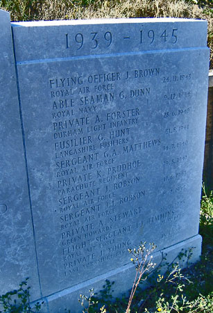 Joseph Robson, photograph via Paul Dixon and originally shown on the superb website "www.halifaxlv827.co.uk". Sgt Robson was buried at St Patrick's Churchyard in High Spen, County Durham not at Winlaton Churchyard. Winlaton is three miles from the actual location of their graves. In the 1970s the St Patrick's Churchyard suffered from subsidence and land slippage. Sadly all the gravestones were removed and destroyed but the graveyard was made stable, landscaped and then grassed. In the 1960s an engraved stone was placed on a wall of Hookergate Cemetery, a civil cemetery on land ajoining the church. This plaque carries the names of the War-dead buried at Winlaton. My thanks to Mr Brian Pears for much of this information and for the photos of the memorial shown above. The Sgt Timmins listed below Sgt Robson's name on the memorial was killed in a flying accident on the North Yorkshire Moors when Halifax EB181 crashed near Kepwick Bank.