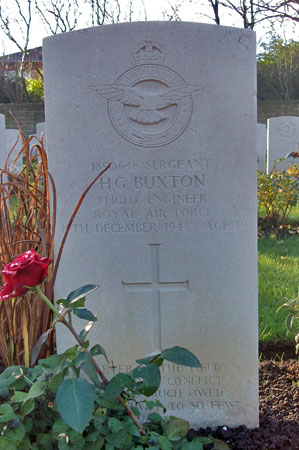 Flight Engineer - Sgt Harry Gilbert Buxton RAFVR (1850646), aged 19, wife of Cheltenham, Gloucestershire. Buried Harrogate Stonefall Cemetery, Yorkshire (C/G/16).