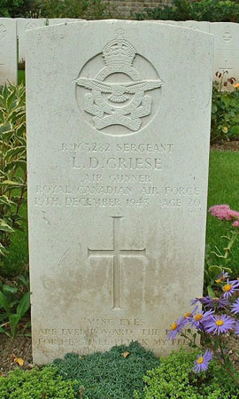 Air Gunner - Sgt Leonard David Griese RCAF (R/163282), aged 20, of Toronto, Ontario, Canada. Buried Harrogate Stonefall Cemetery, Yorkshire (C/G/12).