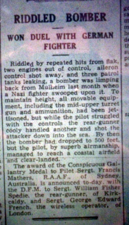 "One night in June, 1943, Sergeants French and Speedie were the wireless operator / air gunner and rear gunner respectively of an aircraft piloted by Flight Sergeant Mathers, which attacked Mulheim. Whilst over the target area, the bomber was subjected to heavy fire from the ground defences and was repeatedly hit. Two engines were rendered unserviceable in quick succession, while the starboard aileron control was shot away and 3 petrol tanks were pierced all of which leaked rapidly. In spite of this, Flight Sergeant Mathers flew clear of the defences and set course for this country. On the return flight, the bomber gradually lost height and all movable equipment including the guns of the mid-upper turret and some ammunition, were jettisoned. Shortly after crossing the enemy coast, the disabled aircraft was intercepted by an enemy fighter. In the ensuing engagement, Sergeant Spedie skillfully used his guns and, eventually with a devastating burst from close range, he shot the attacker down into the sea. The bomber was down to 500 feet but, displaying superb airmanship, Flight Sergeant Mathers, receiving much assistance from Sergeant French who diligently worked his wireless apparatus to obtain direction fixes, struggled to reach an airfield near the coast. Although the undercarriage could not be lowered, this pilot successfully effected a crash-landing. In most harassing circumstances Flight Sergeant Mathers displayed exceptional skill, courage and fortitude, while Sergeants French and Spedie displayed conduct worthy of the highest praise."
