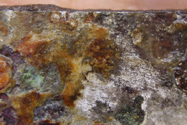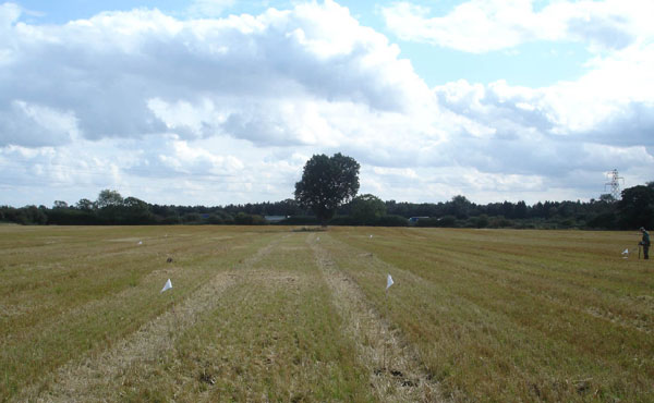 I visited the site in September 2008 with fellow air historians Ken Reast, David Thompson, Albert Pritchard and Eric Barton. Our time at the site was limited due to a thunder storm but it was long enough to find a scatter of pieces of the aircraft on the surface of the field to determine where it came down, and infact this is all the we ever wish to do on such visits. The site is today close to the main A64 York by-pass. We also visited the memorial to the crew located on Fulford Golf Course. Thanks to Mr Hawkswell, the landowner for letting us visit the site and for the help he was able to provide. The photograph above shows the general area of the crash whilst the piece below (although hard to make out) shows a Halifax part number with the prefix "59" referring to a part for the MkII Halifax variant along with an "EEP" English Electric Preston inspection stamp, that being the factory that JB863 was made.