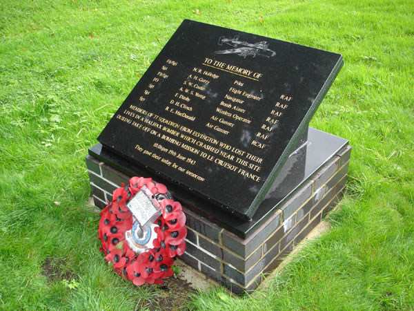 This 77 Squadron aircraft took off from Elvington at 22.04hrs on the night of 19th June 1943 for an operational flight to Le Creusot, France to bomb the Schneider factory. Immediately after becoming airborne the aircraft swung to starboard having only climbed to 300 feet. It then sideslipped into the ground two minutes after leaving the airfield and only two miles from the end of the runway. The aircraft was destroyed in the resulting crash and the crew stood little chance of survival. The crash was attributed to the failure of the starboard inner engine. In the 1950s the site was finally cleared of its bomb load which one assumes had buried itself at the time of the crash.