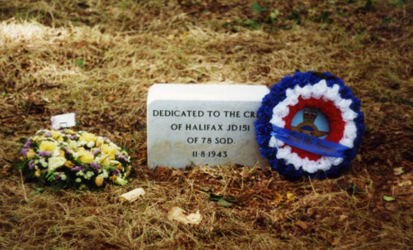 The AM Form 1180 gives a map reference location of the accident and this plots to being near Bowthorpe Hall. A small memorial plaque was placed two miles away within Intake Plantation, Wressle close to the crash site of Halifax DT524 in more recent years but it is unfortunately at the wrong location. This appears to have been because the information that was on display at the Yorkshire Air Museum relating to where JD151 and DT524 crashed were mixed up and whomever arranged for the memorial probably used that information as being correct. Historians Albert Pritchard, Eric Barton and Ken Reast located small fragments of Halifax DT524 with permission from the landowner, confirming the crash location as being near Bowthorpe Hall. They also located the correct crash site of Halifax JD151 proving the correct map reference on the AM Form 1180.