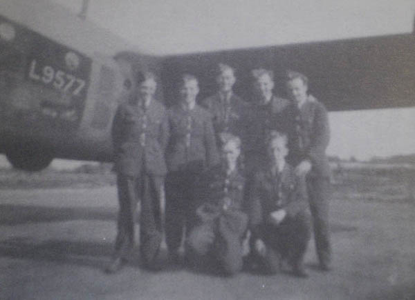 A poor copy of a photograph showing part of Halifax L9577 in the background. The crew shown remain unidentified.