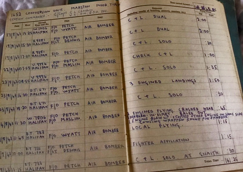 A copy of Thomas Telford's flying log book of the date of this incident. I thank his daughter for kindly supplying this.