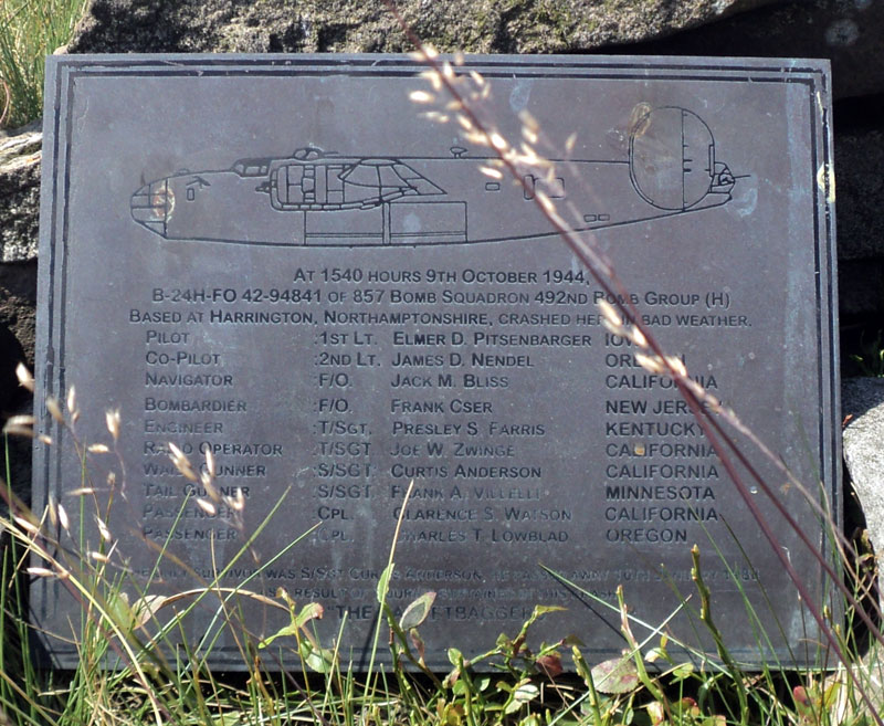 On 9th October 1944 the crew of this aircraft were undertaking a training flight and also the flight was to act as a test flight for the aircraft as it had just had repairs carried out. The aircraft took off from Harrington, Buckinghamshire and headed north from their base to the Scottish border. On arrival here the weather was bad so the crew opted to return to base. When the arrived back over the Yorkshire area the weather here was poor as well and flying over Holmfirth the aircraft was too low to clear the high ground they were flying towards. The aircraft crashed into high ground towards the north-eastern edge of the Peak District. Sadly nine were killed in the crash, there was one survivor. The body of one member of the crew was never found and identified so he is listed on the walls of the missing. The aircraft and crew were part of the 857th Bombardment Squadron and it carried the nose art "Sack Time".