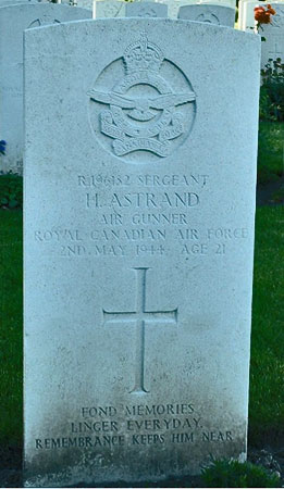 Rear Gunner - Sgt Harry Astrand RCAF (R/196182), aged 21, of Port Arthur, Ontario. Canada. Buried Harrogate Stonefall Cemetery, Yorkshire (B/B/14).