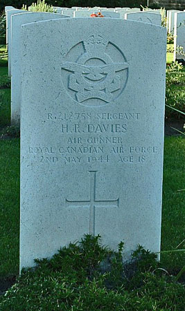 Air Gunner - Sgt Herbert Russell Davies RCAF (R/212758), aged 18, of Toronto, Ontario, Canada. Buried Harrogate Stonefall Cemetery, Yorkshire (B/B/15).