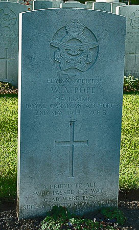 Navigator - F/O William Alexander Pope RCAF (J/28866), aged 32, of Halifax, Nova Scotia. Buried Harrogate Stonefall Cemetery, Yorkshire (B/B/17).