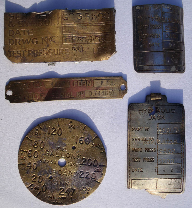 In the 1970s air historian Nick Roberts was contacted by the landowner Mr Hubert Robinson to explain that he believed that there were three engines still buried on the crash site. In August 1977 both starboard engines were recovered by Nick Roberts, Mr Robinson and a team of volunteers. The photograph above shows the site as the first trial dig began. The recovered engines were restored to museum standard by Robin Goodman and Mark Lewis. Nick took ownership of one of the engines while Mr Robinson retained the other. Nick's engine was the first to be displayed at, what was then, the newly formed Yorkshire Air Museum, but was later returned to him. Mr Robinson's engine was donated to the Yorkshire Air Museum in 1985 and is still on display there. In 1992 the port inner engine was recovered from the site and after the restoration was begun by Robin Byers it was completed to a running condition by Peter Grieve / Flight Engineering. The fourth / port outer engine was recovered at the time of the crash to try and discover why it had failed. During the dig in the 1970s a number of small finds were also recovered and photographs of some of the plates Nick kept are shown below. The field where the aircraft crashed has now been taken over by the expanded golf course and a road now covers the crash site.