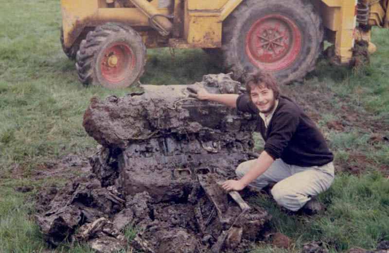 This is almost certainly the starboard outer engine of Halifax DG226 that was recovered from the crash site in August 1977. Nick Roberts (seen with it) obtained this engine after the dig and after full cleaning and restoration by Robin Goodman it was displayed at the Yorkshire Air Museum when it formed but was later returned to Nick Roberts. Where this engine is now is not known. Nick and I would love to learn what happened to it.