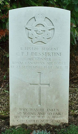 Air Gunner - Sgt Claudien Paul Joseph Dessertine RCAF (R/225429), aged 21, of Chambly, Quebec, Canada. Buried Harrogate Stonefall Cemetery, Yorkshire (E/E/8).