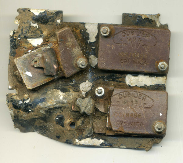 Air historians Albert Pritchard, Eric Barton and Ken Reast located small fragments on the surface in the woodland at the crash site in August 1998 with permission from the landowner, confirming the crash location. In notes Eric made he stated that the course the aircraft had flown was still visible in the woodland by a series of aged and weathered tree stumps heading out towards a field. The photograph above shows a fragment of the aircraft's radio equipment found by Eric Barton at the site.