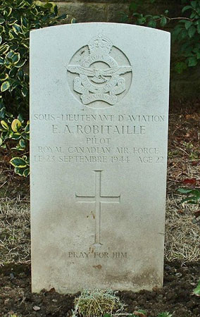 Edgar Robitaille was born on 2nd December 1921 at Ottawa, Ontario, Canada and was the son of Eugene and Marguerite (nee Carriere) Robitaille. As a young man he worked for the Royal Bank of Canada and later in advertising for the Imperial Tobacco Co.Ltd. He enlisted for RCAF service on 17th July 1942 in Ottawa and after basic training as a pilot in Canada he was awarded his pilots' flying badge, and also a commission on 1st October 1943. On arrival in the UK he trained at 14 (P)AFU and at 22 OTU before posting to 1664 HCU on 30th August 1944.