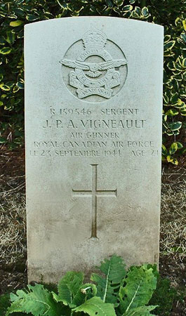 Air Gunner - Sgt Joseph Philorome Ambroise Vigneault RCAF (R/159546), aged 24, of Quebec City, Canada. Buried Harrogate Stonefall Cemetery, Yorkshire (E/E/10).