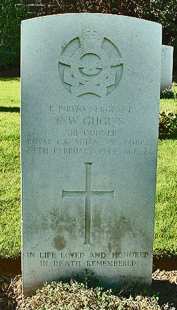 Air Gunner - Sgt Clarence Walter Gugins RCAF (R/191070), aged 23, of Winnipeg, Manitoba, Canada. Buried Harrogate Stonefall Cemetery, Yorkshire (F/B/1).