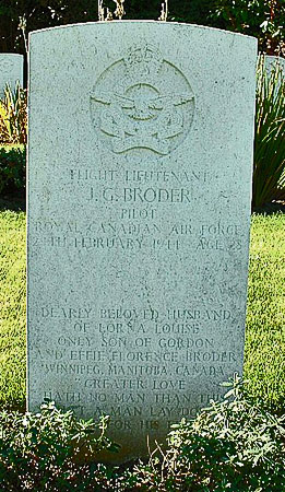 Pilot - F/Lt John Gordon Broder RCAF (J/5048), aged 28, of Winnipeg, Manitoba, Canada. Buried Harrogate Stonefall Cemetery, Yorkshire (F/B/4).
