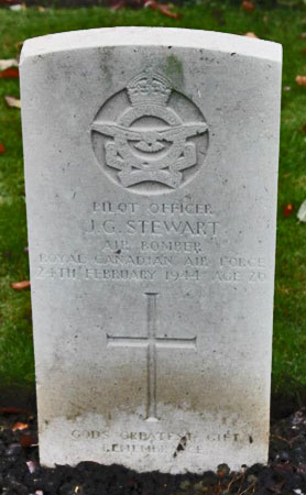Bomb Aimer - P/O James Gordon Stewart RCAF (J/87408), aged 20, of Winnipeg, Manitoba, Canada. Buried Harrogate Stonefall Cemetery, Yorkshire (F/B/2).