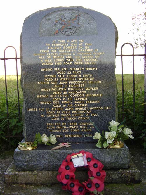 During the morning of 7th February 1944 this 1663 Heavy Conversion Unit aircraft was used to fly a day time training flight. While the unit were based at Rufforth airfield the aircraft may not have taken off from there because around this date construction work was being carried at Rufforth so trainee crews used other airfields in the general area to the east of York. At 10.15hrs and whilst flying in low cloud the aircraft flew into the top of Garrowby Hill, to the west of Stamford Bridge, crossed a road and caught fire. Sadly the crew died as a result of the crash. A milk lorry happened to be travelling up the road at the time and the aircraft struck this lorry, the driver of which was also killed. One of the crew was able to escape from the burning aircraft and ran to rescuers for help, he was taken to York Hospital but sadly died soon after. A member of this aircraft's regular crew was in hospital at the time and as a result of the accident had lost all of his crew, he would later complete his training and be posted to an operational squadron. It was through the efforts of this man, Mr Alun Emlyn-Jones; the crew's regular bomb aimer and through others that a memorial stone was erected at the crash site and unveiled on 8th May 1996. Brian Mennell's "Wings Over York" book gives a superb account of this incident. Many of the crew are pictured in this book. On 1st August 1999 a ghostly figure thought to have been one of the crew was seen at the crash site who apparently spoke to a lady who had parked in the lay-by where the memorial is sited.