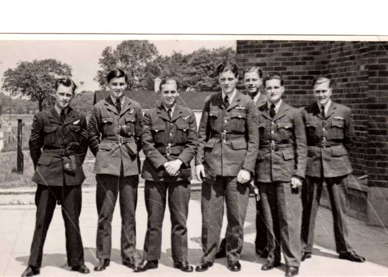 Through correspondance with Sinclair Laird's family in 2010 it transpires that the photograph was probably taken just before Sinclair was married and almost certainly at his Stag night in June 1944. His brother is known to have attended this party. Sinclair Laird was married for only six weeks before he was sadly killed in this accident detailed above and while buried in Manchester and combined with CWGC listing his wife as being from Northenden, Manchester he was actually a Scot as perhaps his surname would suggest. He lived in Motherwell where he worked in the Police before enlisting. He received his commission on 18th May 1944 to P/O on probation (emergency). The man shown second right is Hector Laird, Sinclair Laird's brother, he served in the RAF as ground-crew during the War spending time in Lincolnshire and later in the Middle-East. He passed away in 2000.
