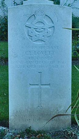 Air Gunner - Sgt Charles Edward Lovett RCAF (R/208139) aged 18, of St.Catharines, Ontario, Canada. Buried Harrogate Stonefall Cemetery, Yorkshire (B/A/6).