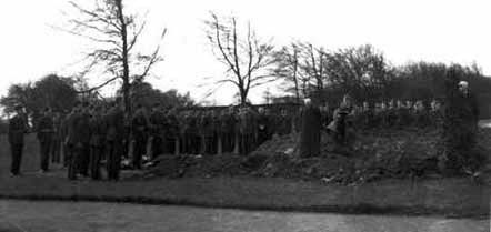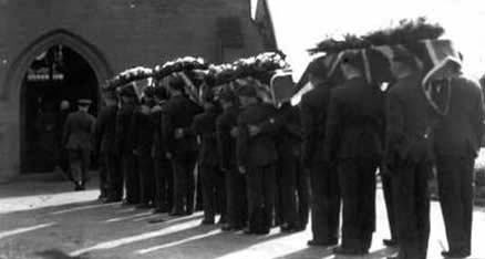 These photographs are not intended to be morbid but give an impression af what every airman's funeral service must have been like at Harrogate Stonefall Cemetery during the War. The top photograph shows the crew of EB203 been carried into the Cemetery Chapel and the lower one shows their burial. Probably a similar and all too frequent occurance here for the two years it was used as the main War Cemetery in North Yorkshire.