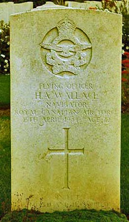 Navigator - F/O Hugh Alexander Wallace RCAF (J/23362), aged 32, of Midland, Ontario, Canada. Buried Harrogate Stonefall Cemetery, Yorkshire (B/A/9).
