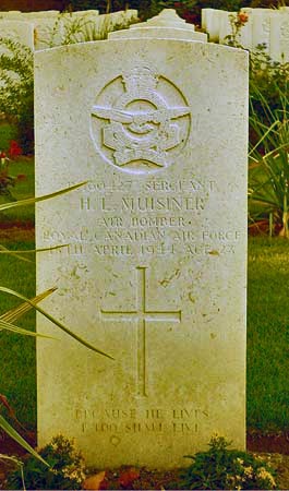 Bomb Aimer - F/Sgt Homer Leroy Muisiner RCAF (R/160427), aged 23, of Kane, Pennsylvania, U.S.A. Buried Harrogate Stonefall Cemetery, Yorkshire (B/A/7).
