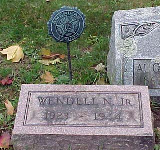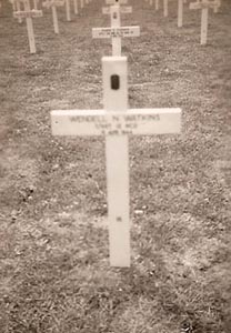 Wendell N Watkins Jnr (above) was the son of Wendall (Snr) and Herberta Watkins of Gowanda, USA, he was born in 1923. He graduated from Gowanda High School in 1941 and applied to join the United States Air Force but they would not accept him because he only had a high school diploma so he then applied to join the RCAF and was accepted and completed much of his training with the RCAF before transferring to the USAAF in 1943 to join the European Theatre of War. Following his death he was initially buried in the large American cemetery near Cambridge (the left photo shows his headstone there). His body was returned home to be re-interred in the USA in 1948. The service was conducted on 21st July 1948 with burial at Collins Center Cemetery, New York afterwards, with six school-friends walking as an escort to the graveside. Much of this information was researched by Mr Phil Palen, of Gowanda, New York and was passed to Mr Leslie Green, and in turn to me. The modern photograph of his gravestone in the USA is through Mr Palen and I thank for this and his research. The photograph of his original grave marker/cross was kindly sent to Mr Green by Wendell Watkins' sister Mrs Judy Watkins Pickering to whom I am most greatful.