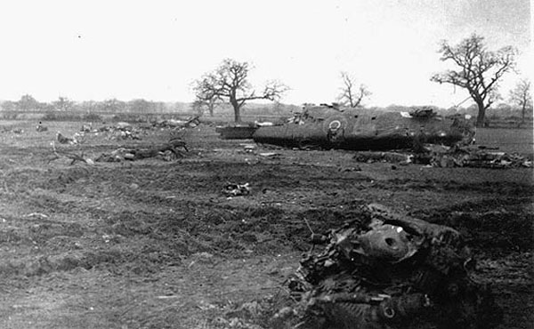 During the night of 12th / 13th April 1944 the crew of this 1663 Heavy Conversion Unit, based at Rufforth airfield, were undertaking a basic night flying exercise consisting of a series of practice take offs, flying circuits of the airfield and landing. The first three short flights were made with an instructor present and while the first two short flights were not perfect by the time the third was made with the instructor he was satisfied with the way the flight was made. After landing following the third flight the instructor left the aircraft having asked the trainee crew to fly further circuits and landings on their own. This was a common type of basic training flight for trainee Halifax crews to make and a common way of carrying it out. At 00.46hrs the aircraft took off for the fourth time. After taking off the aircraft did not climb above 100 feet off the ground and remained in a direct line with the runway for a few miles. It then clipped the top of a first tree, 150 yards later flew through a second tree which removed the starboard outer portion of the wing and then rolled over before crashing around 300 yards from the impact with the first tree south of the village of Healaugh. The crash removed the rear fuselage of the aircraft from behind the main spar, this appears to have saved the rear gunner's life. The rest of the aircraft disintergrated and the rest of the crew were sadly killed. All except the pilot had previously served with 158 Squadron.