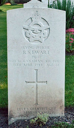 Pilot - F/O Ross Stuart Ewart RCAF (J/35149), aged 22, of Toronto, Ontario, Canada. Buried Harrogate Stonefall Cemetery, Yorkshire (B/A/1).