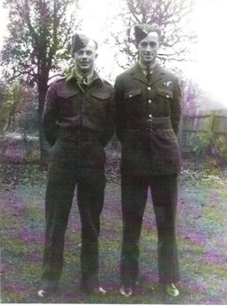 Sgt French's gravestone and photograph of him and also shown is a further photograph of him with his brother Charles, this photograph was taken the day the two were arranging his brother's wedding to which Ken was to have been Charles' best man. Apparently the first the family knew that there was a problem was when he failed to turn up for the wedding (Photos Mr C. French, via Mr L. Green). Kenneth French was born on 28th January 1923 at Creston, British Columbia, Canada and was the son of Arthur Everton and Barbara (nee Wagun) French. Both his parents were born in the USA. He was still at school when he enlisted for RCAF service on 23rd October 1942 in Vancouver and after training he was awarded his air gunners' flying badge on 17th September 1943. On arrival in the UK the following month he trained at 22 OTU before posting to 1664 HCU on 18th March 1944.