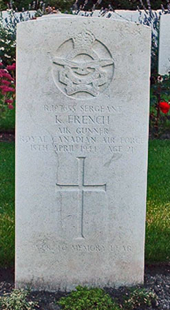 Air Gunner - Sgt Kenneth French RCAF (R/197655), aged 21, of Creston, British Columbia, Canada. Buried Harrogate Stonefall Cemetery, Yorkshire (B/A/10).
