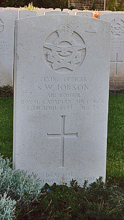 Bomb Aimer - F/O Stewart Walter Jobson RCAF (J/27433), aged 25, of Renfrew, Ontario, Canada. Buried Harrogate Stonefall Cemetery, Yorkshire (B/A/13).