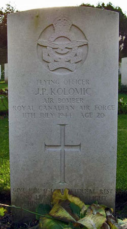 Air Bomber - F/O Johnny Peter Kolomic RCAF (R/35077), aged 20, of Winnipeg, Manitoba, Canada. Buried Harrogate Stonefall Cemetery, Yorkshire (B/H/14).