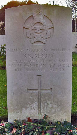 Wireless Operator / Air Gunner - WO1 Robert Kirk Moore RCAF (R/124087), aged 22, of Winnipeg, Manitoba, Canada. Buried Harrogate Stonefall Cemetery, Yorkshire (B/H/18).