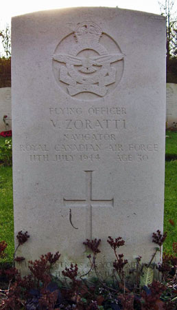 Navigator - F/O Victor Zoratti RCAF (J/35036), aged 30, of Winnipeg, Manitoba, Canada. Buried Harrogate Stonefall Cemetery, Yorkshire (B/H/15).