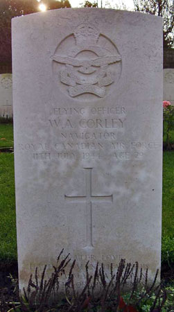 Navigator - F/O William Arthur Corley RCAF (J/36334), aged 29, of Toronto, Ontario, Canada. Buried Harrogate Stonefall Cemetery, Yorkshire (B/H/19).