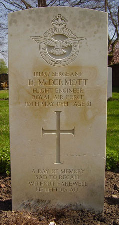 Flight Engineer - Sgt Derrick McDermott RAFVR (1111437), aged 21, of Wakefield, Yorkshire. Buried Selby Cemetery, Yorkshire (Grave 5317).