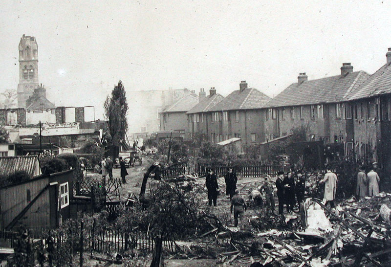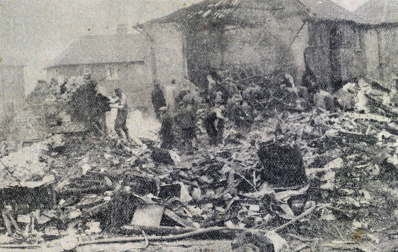 As a result of the accident all seven trainee aircrew died. A night watchman who was inside the burning Portholme Mill died soon after of his injuries, a young mother and her daughter died in No.32 Portholme Drive and in No.30 Portholme Drive a father, mother and two of their young children sadly lost their lives. In total fifteen people died. To date I have found details of some of the injured whom I list below. Perhaps the most remarkable story of survival is that of young Jean Osbourn; her parents and two siblings were killed in the crash but she appears to have been blown out of a bedroom window in the crash and into her garden, she then managed to run around to the front of the house and sustained very few physical injuries. She later emigrated to Canada. I thank her for contacting me during the early stages of my research. Other members of the family living in No.34 Portholme Drive managed to escape from upstairs windows as did others from either/or No.28 and No.36 Portholme Drive. These photographs show the crash scene at the back of the houses on Portholme Drive with the damaged church shown in the top photograph.