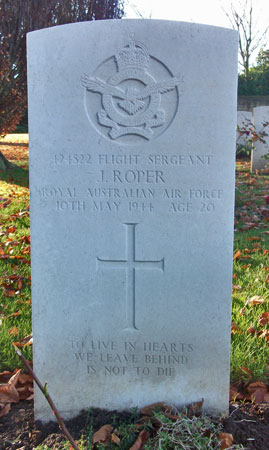 Air Gunner - F/Sgt John Roper RAAF (424822), aged 20, of Waverley, New South Wales, Australia. Buried Harrogate Stonefall Cemetery, Yorkshire (B/C/1).