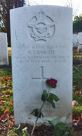Wireless Operator / Air Gunner - F/Sgt Noel Joseph Knight RAAF (423420), aged 21, of Kensington, New South Wales, Australia. Buried Harrogate Stonefall Cemetery, Yorkshire (B/C/2).