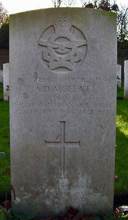 Pilot - P/O Archibald Douglas Moffat RCAF (J/88479), aged 21, of East Winnipeg, Manitoba, Canada. Buried Harrogate Stonefall Cemetery, Yorkshire (B/K/7).