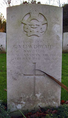 George Lewthwaite and his gravestone at Harrogate Stonefall Cemetery, Yorkshire. He was born on 5th September 1913 to William David and Mary Gertrude (nee Huxtable) Lewthwaite, of Montreal, Province of Quebec, Canada. As a young man he obtained a B.A. degree at Queen's University, Kingston, Ontario and worked as a teacher at various schools beginning in 1933. He enlisted into the RCAF on 17th September 1942 at Montreal. He married Madeleine Thompson, of Montreal on 24th December 1942. After training he was awarded his air navigation wings on 15th October 1943 and also a commission on the same date. Soon after completing his training in Canada he was posted to the UK and arrived in November 1943. He trained at 6 (O)AFU and 24 OTU before posting to 1666 HCU with the rest of his crew in June 1944.