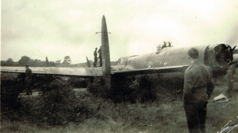 On the night of 17th / 18th September 1944 the crew of this 419 Squadron aircraft were to undertake an operational flight to bomb Walcheren and the aircraft took off from Middleton St. George airfield at 15.34hrs. Outbound the raid was called off by the Master Bomber because the crews flying the target marking Mosquitos failed to locate the target because of thick cloud. As the returning aircraft headed north back to their bases the weather also became poor. This 419 Squadron aircraft was diverted to land at East Moor due to fog further north. At 20.36hrs this aircraft landed at East Moor with a full bomb load and too fast, it overshot the landing (which must have been on the main North-South longer runway). Due to the additional weight and the higher than normal landing speed the aircraft failed to stop in the available runway area. It ran off the end of the runway, through the ditch (at the Strensall Road end) which tore off both main undercarriage legs. It came to rest on the road just beyond the hedge. The photographs shown below of the incident show the aircraft across the hedge / fence that borders the airfield. The AM Form 1180 states that this aircraft was the thirteenth aircraft to do exactly the same thing because of the downhill runway and there being a ditch at the end of the runway. Various high ranking officers had complained of the ditch for some months following more and more accidents and it was eventually covered over. I had previously linked this aircraft as coming to rest across the airfield camp to Sutton on Forest village road but, with the information given on the AM Form 1180, this is clearly wrong. This crew became a well decorated crew and they all survived the War.