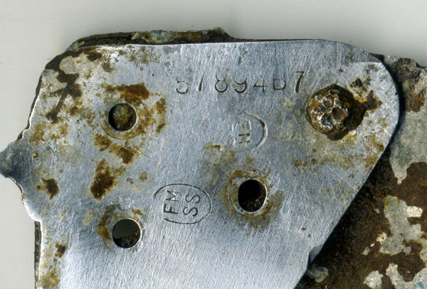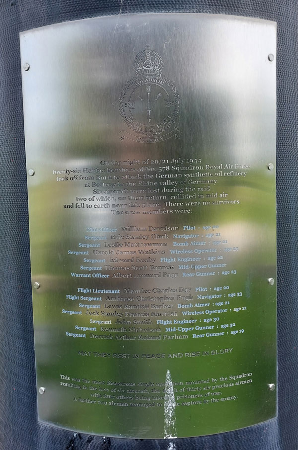 Well before the memorial was thought about air historians Eric Barton, Ken Reast and Albert Pritchard located surface remains on the site of where the aircraft crashed in March 1997 with permission of the landowner Mr George Wilburn. Mr Wilburn has since died. The photograph shown above is of a small piece of one of the aircraft retained by Eric Barton following his search in 1997, the "57.." number prefix identifies the item as being from a Halifax. The memorial is not on the crash site but overlooks the area.