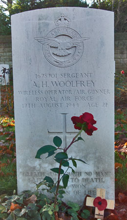 Wireless Operator / Air Gunner - Sgt Allen Henry Woolfrey RAFVR (1678701), aged 21, of Chaddesden, Derbyshire. Buried Harrogate Stonefall Cemetery, Yorkshire (E/B/9).
