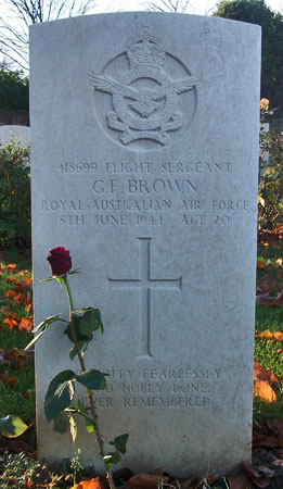 Wireless Operator / Air Gunner? - F/Sgt Gilbert Francis Brown RAAF (418699), aged 20, of Tolmie, Victoria, Australia. Buried Harrogate Stonefall Cemetery, Yorkshire (B/E/10).